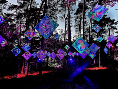 Mitten im Wald erwartet Sie ein UV-Wunderland aus abstrakten und lebendigen Kunstwerken, gemalt auf Acrylglas. geschaffen, um eine ganz besondere visuelle Reise zu gewährleisten. Hier finden Sie einen Ort der unendlichen Vielfalt und bewegender Gemälde, die zum Verweilen und Seelenbaumeln einladen. Um noch tiefer in die Welt der Farben einzutauchen, können Sie sich eine 3D-Chroma-Tiefenbrille ausborgen und die Kunstwerke auf einer weiteren Ebene erkunden.