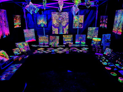 In dieser Zeltausstellung finden Sie eine Vielzahl fluoreszierender Gemälde von ArtUVisual by TimBo, sowohl auf Leinwand als auch auf Acrylglas. Zwischen organischen und abstrakten Strukturen, leuchtenden Farben und 3D-Effekten können Sie jedes einzelne Stück aus der Nähe erkunden. Um noch tiefer in die Welt der Farben einzutauchen, können Sie sich eine 3D-Chroma-Tiefenbrille ausborgen und die Kunstwerke auf einer weiteren Ebene erkunden