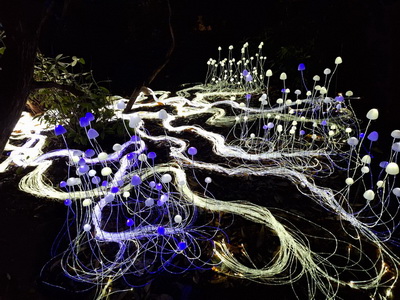 Diese Installation verwendet Tausende dünner Glasfaserstränge, um das riesige Myzel-Netzwerk darzustellen, welches oft direkt unter unseren Füßen wächst. Leuchtende Pilze unterschiedlicher Größe und Höhe verändern sanft ihre Farbe, während unter ihnen ein sehr realistischer Myzelteppich pulsiert und seine Farbe mit unterschiedlichen Intensitäten ändert, was den Anschein erweckt, als würden die Pilze kommunizieren. Eine uns sonst verborgene Welt wird sichtbar gemacht!