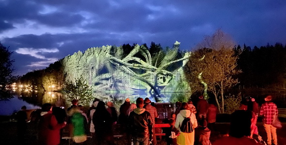 Reinhard bricht die Normen, um den Wald selbst (nichts liegt näher im Waldviertel) zu einer dreidimensionalen Projektionsfläche zu machen. Vernetzte, äußerst lichtstarke Projektoren bilden dabei eine miteinander verwobene Naturleinwand. Die eigens dafür erstellten minimalistischen Bilder und Animationen bewegen sich langsam über die Baumstrukturen und eröffnen dadurch die dritte Dimension. Blätter, Nadeln, selbst die Bewegungen der Wipfeln im Wind verschmelzen zu einem Gesamteindruck und kreieren immer neue unvorhersehbare Formen, Strukturen und Muster.